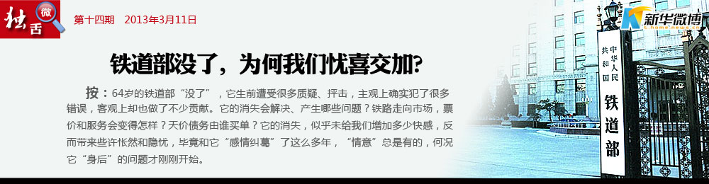 @秋水伊人:之前累積的債務(wù)問題如何解決?誰(shuí)是還債主體?明年春運(yùn)被“吐槽”的是誰(shuí)?撤銷鐵道部體現(xiàn)了改革的決心,希望能有好的轉(zhuǎn)變。