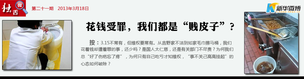 @食不果腹:【事不關(guān)己高高掛起】吉野家棄飯上桌,如家毛巾擦廁所,若是不遇3·15,想必事實(shí)必被埋沒(méi),曝光丑態(tài)如此難,我沒(méi)遭遇干嘛管,人人都是此心態(tài),社會(huì)早晚成病態(tài)。
