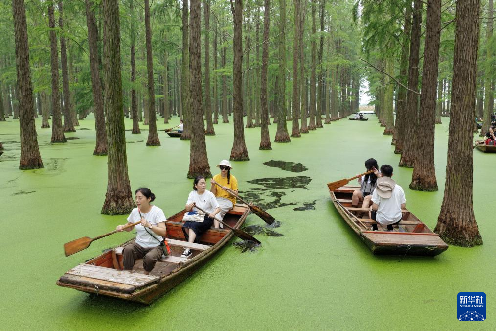 10月5日,游客在江苏省扬州市渌洋湖湿地公园的“水上森林”乘船游览(无人机照片)。