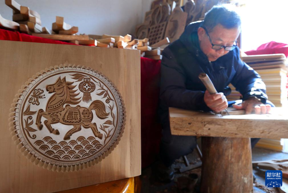 1月17日,在青岛市即墨区,山东省青岛市级非物质文化遗产代表性传承人王承厚创作马题材的榼子。