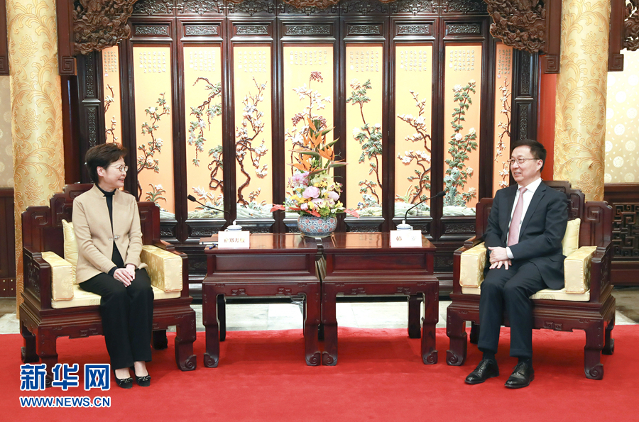 3月6日,中共中央政治局常委、國(guó)務(wù)院副總理韓正在北京釣魚(yú)臺(tái)國(guó)賓館會(huì)見(jiàn)香港特別行政區(qū)行政長(zhǎng)官林鄭月娥。新華社記者 龐興雷 攝