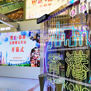 此次主題展展臺外觀通透明亮,內(nèi)部搭配錯落有致的霓虹招牌,還呈現(xiàn)香港古跡和香港街道的場景,讓觀眾身在北京也能感受到香港豐富多元的都巿面貌,體驗(yàn)濃厚的“港風(fēng)”。展覽分為六大主題,包括“香港連接內(nèi)地與世界的橋梁功能”“商貿(mào)金融和創(chuàng)新科技”“多元文藝發(fā)展”“薈萃古今中外文化的特色”“綠色城市風(fēng)光”“京港合作交流”。展臺還設(shè)有兩個互動裝置,以富有趣味的方式讓參觀者“連系”香港,并為香港送上祝福。