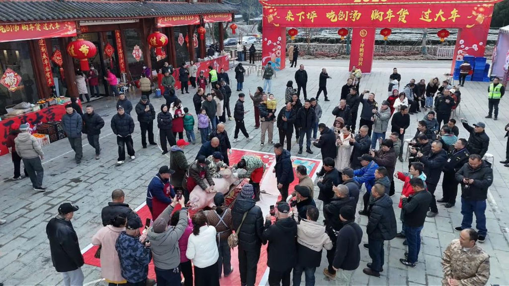 新华社武汉2月9日电(记者张阳)“上!使点劲儿,按住喽!”年关将至,位于武陵山区的湖北省恩施州鹤峰县迎来了腊月里最具仪式感的民俗活动——刨汤宴,许多外地游客前来赶大集、体验民俗文化。在下坪乡留驾村,记者来到热闹的“刨猪”现场,感受当地红火的年味儿。