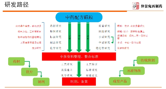 中藥配方顆粒的研制路線(xiàn)是從產(chǎn)品研制開(kāi)始,要經(jīng)過(guò)標(biāo)準(zhǔn)復(fù)核、現(xiàn)場(chǎng)檢查、專(zhuān)家評(píng)審等環(huán)節(jié),最終需獲得藥監(jiān)管理部門(mén)的備案許可。研制路徑的重點(diǎn)主要是前期大量文獻(xiàn)的調(diào)研、過(guò)程中質(zhì)量控制的一致性研究和工藝的穩(wěn)定性、有效性再評(píng)價(jià)等,對(duì)企業(yè)的研發(fā)、人才及經(jīng)濟(jì)方面的投入要求非常高。