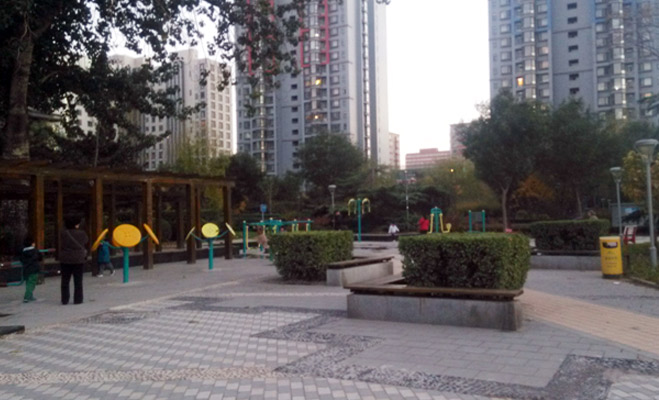中心園林區(qū)呈現(xiàn)環(huán)狀結(jié)構(gòu),周邊依次排列著健身設(shè)施,遮陽長亭以及精神文明建設(shè)的標(biāo)語。不少老年業(yè)主帶著孩子在此遛彎歇腳。