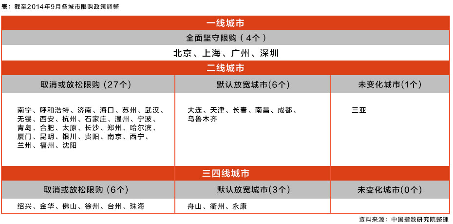 全國(guó)僅五個(gè)城市未放松限購(gòu)。繼4月南寧定向調(diào)整、6月呼和浩特正式發(fā)文取消限購(gòu),進(jìn)入三季度后限購(gòu)調(diào)整呈現(xiàn)多米諾效應(yīng),多個(gè)城市陸續(xù)放寬。截至9月末,全國(guó)47個(gè)限購(gòu)城市中,共有42個(gè)城市有所放寬,僅北京、上海、廣州、深圳、三亞個(gè)城市未做調(diào)整。