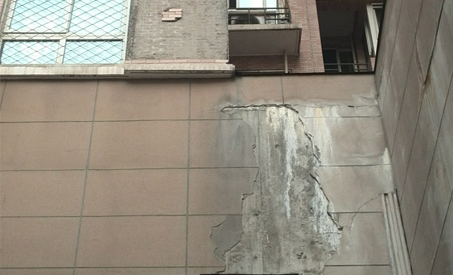 建筑質(zhì)量問題是國瑞城回遷房業(yè)主們普遍抱怨的另一個重要問題。業(yè)主們說,有些樓棟存在墻體裂縫、墻皮脫落的情況,并有數(shù)次墻皮脫落時差點砸傷業(yè)主的情況。