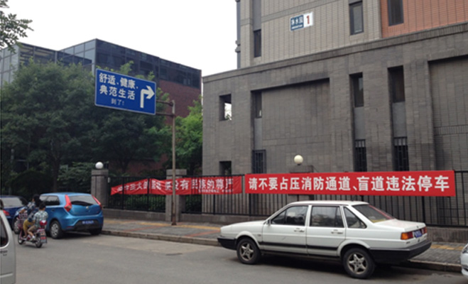 而對于購買了私家車的業(yè)主而言,每天進出小區(qū)也不太方便。記者注意到,盡管嚴(yán)禁占用消防通道的橫幅懸掛在凈水東路兩側(cè),但是,這里依然幾乎停滿了私家車,還有幾輛為了節(jié)約空間,橫著停放在行人道上。