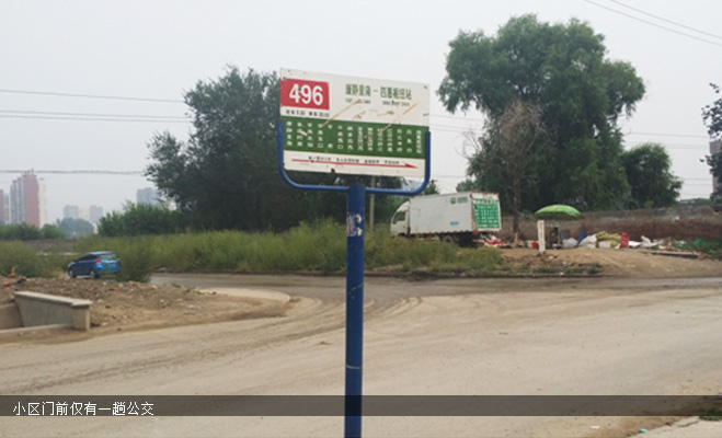 但經(jīng)過記者實地探訪,小區(qū)門前僅有一趟公交496路,需要等待時間20分鐘。并且小區(qū)外揚塵很大,塵土飛揚。