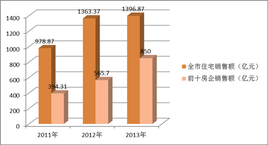 2011-2013年全市住宅銷售額與前十房企銷售額
