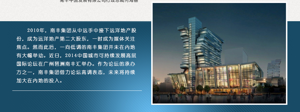 已在內(nèi)地三亞、北京、大連等地有多個項目的南豐中國是南豐集團最接內(nèi)地“地氣”的公司,也更為熟悉內(nèi)地市場與政策。何海基認為當下中國城市可持續(xù)發(fā)展的趨勢使企業(yè)必須在做項目之前就考慮到幾年后買房及用辦公樓的人們對低碳、智慧等需求。【詳情】