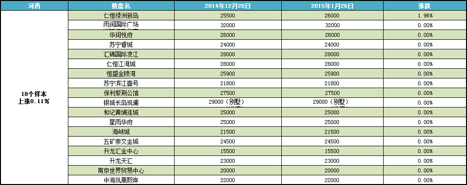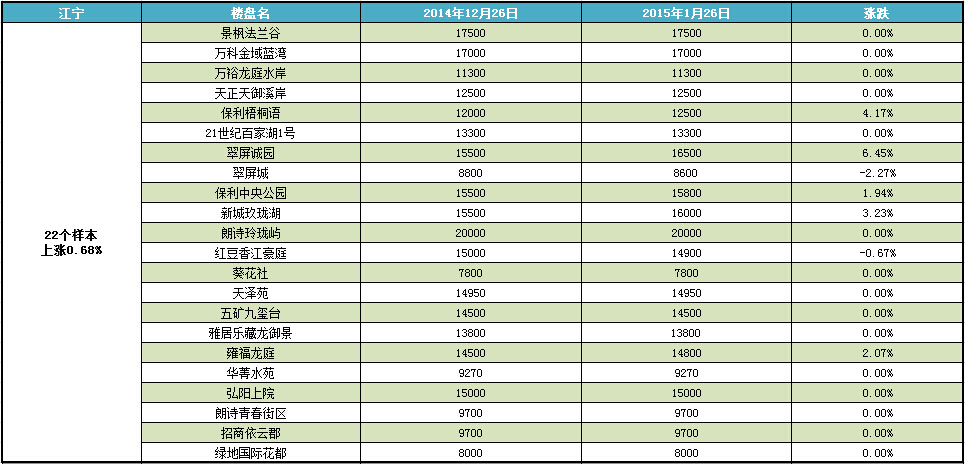 新華房產(chǎn)記者統(tǒng)計(jì)發(fā)現(xiàn),2015年1月南京樓市八大板塊中,江寧、仙林、河西、城東房價(jià)上漲,江北房價(jià)下跌,其余板塊房價(jià)無變動(dòng)。 綜合結(jié)果,1月房價(jià)環(huán)比微漲0.22%。[詳細(xì)]