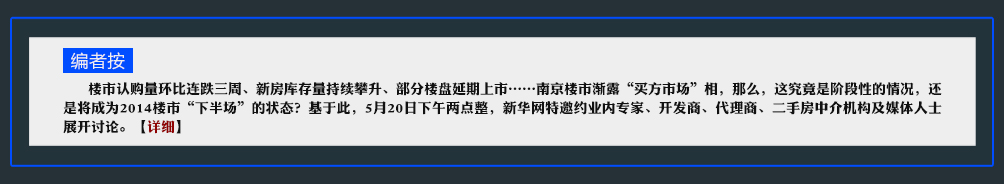 ???? 樓市認購量環(huán)比連跌三周、新房庫存量持續(xù)攀升、部分樓盤延期上市……南京樓市漸露“買方市場”相,那么,這究竟是階段性的情況?還是將成為2014樓市“下半場”的狀態(tài)?基于此,5月20日下午兩點整,新華網(wǎng)特邀約業(yè)內專家、開發(fā)商、代理商、二手房中介機構及媒體人士展開討論。