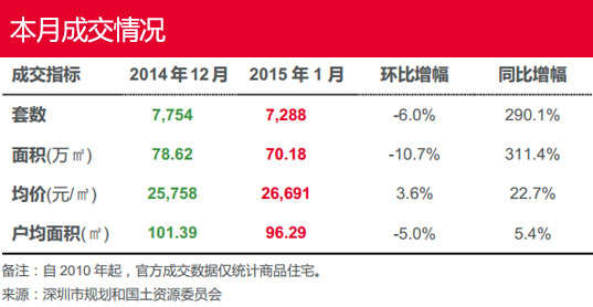 1月住宅成交仍舊處于高位,繼2014年最后一個月突破7000套后保持7000套以上記錄(自2009年07月以來),成交面積約70萬平方米,環(huán)比跌6.0%,成交面積跌10.7%,成交均價微漲3.6%;同比成交套數(shù)漲2.9倍,成交面積漲3.1倍,成交均價漲22.7%。