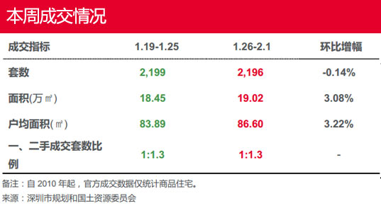 本周(1.26-2.1)一手樓成交價量齊跌,成交套數(shù)及成交面積環(huán)比跌幅均接近一成;全市成交均價微跌1.98%。