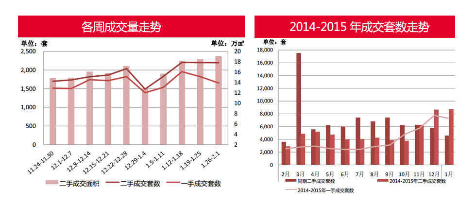 政策層面寬松,市場活躍,1月二手樓成交8706套,是2014年全年月平均成交套數(shù)的2倍左右。二手樓成交套數(shù)環(huán)比基本持平,同比暴漲超九成。