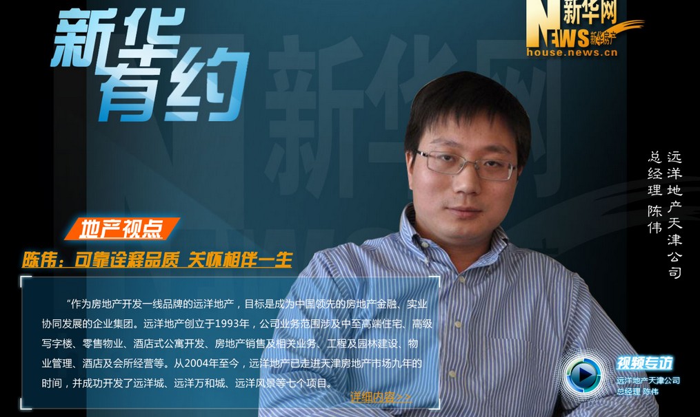 作為房地產(chǎn)開發(fā)一線品牌的遠(yuǎn)洋地產(chǎn),目標(biāo)是成為中國領(lǐng)先的房地產(chǎn)金融、實(shí)業(yè)協(xié)同發(fā)展的企業(yè)集團(tuán)。遠(yuǎn)2004年至今,遠(yuǎn)洋地產(chǎn)已走進(jìn)天津房地產(chǎn)市場(chǎng)九年的,并成功開發(fā)了遠(yuǎn)洋城、遠(yuǎn)洋萬和城、遠(yuǎn)洋風(fēng)景等七個(gè)項(xiàng)目。新華網(wǎng)新華房產(chǎn)榮幸的邀請(qǐng)到遠(yuǎn)洋地產(chǎn)天津公司總經(jīng)理陳偉,共同分享遠(yuǎn)洋地產(chǎn)在天津的成長之路。
