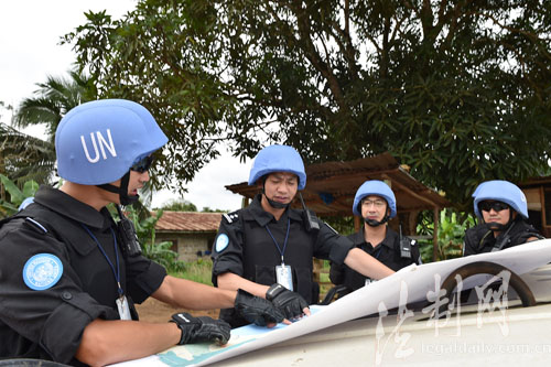 圖為防暴隊黨總支書記徐曉偉(左三)帶隊執(zhí)行利比里亞博米州武裝巡邏任務(wù)
