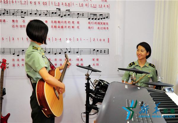 多才多藝的高向云與戰(zhàn)友切磋樂(lè)器演奏技藝。張立培 攝