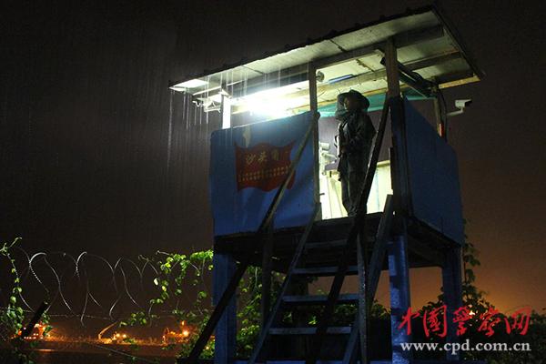 ????崗?fù)ど希瑹艄庀?,筆直的身影密切注視著營區(qū)四周,曾經(jīng)有小偷趁雨夜藏匿海邊的雜草叢中,隊(duì)員及時(shí)發(fā)現(xiàn)并驅(qū)離,在雨夜里隊(duì)員們格外警惕,確保營區(qū)安全。(邵梁攝)