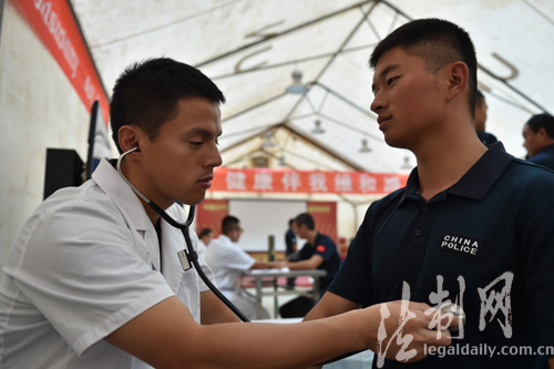 圖為醫(yī)護人員使用聽診器對隊員身體進行檢查