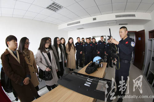 ????上午9時(shí),一輛掛著“相約藍(lán)盔、愛在警營(yíng)”紅色橫幅的大巴車緩緩駛?cè)刖?duì)營(yíng)區(qū)。一下車,姑娘們饒有興致地參觀了警隊(duì)內(nèi)務(wù)設(shè)置和裝備展示,現(xiàn)場(chǎng)觀看了藍(lán)盔方陣扣人心弦的戰(zhàn)術(shù)表演,隊(duì)員們氣吞萬里的練兵激情、敢打必勝的過硬素質(zhì),一下子吸引了大家的眼光。在此之前,她們只是在心中默默仰慕那頂“藍(lán)色貝雷帽”,從電視上看到過威武帥氣的維和隊(duì)員。第一次如此近距離接觸,讓不少姑娘的心中蕩起層層漣漪。