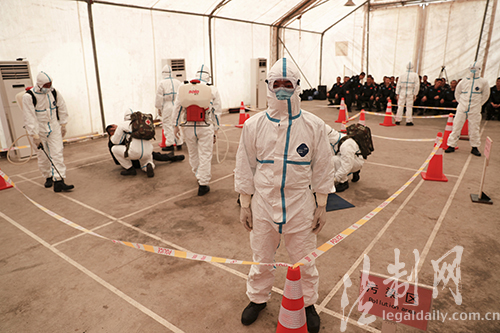 圖為維和警察防暴隊開展綜合防疫衛(wèi)勤科目演練