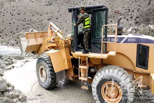 圖為邊防官兵正在指揮鏟車進(jìn)行搶修道路