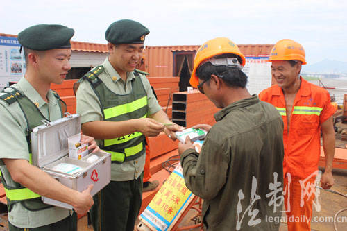 圖為龍港邊防派出所官兵為當(dāng)?shù)靥镩g作業(yè)的農(nóng)戶送去防暑藥品