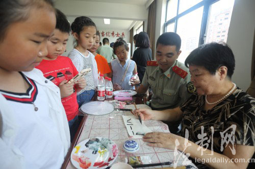 ????為慶祝建軍90周年,7月26日上午,在“八一”建軍節(jié)即將來臨之際,舟山市定海區(qū)昌國街道夕陽紅書畫攝影協(xié)會(huì)的七位老藝術(shù)家和翁山社區(qū)的十幾位小朋友一起走進(jìn)浙江邊防總隊(duì)舟山邊防支隊(duì),開展“情系夕陽紅,警民魚水情”慰問活動(dòng),受到了官兵們的熱烈歡迎。