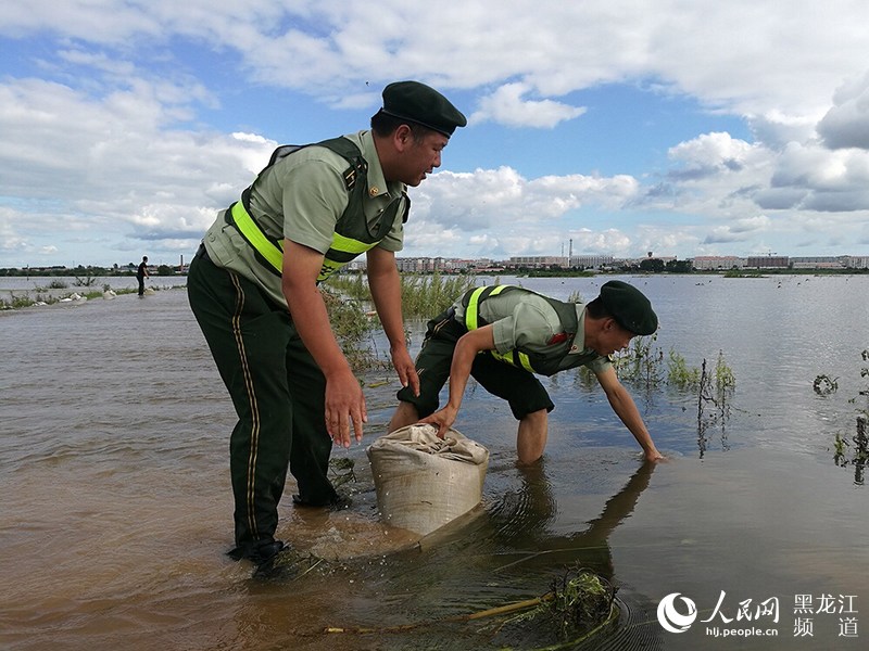 黑龍江省撫遠市鴨南鄉(xiāng)境內(nèi)河水暴漲淹沒公路,邊防官兵緊急救援。