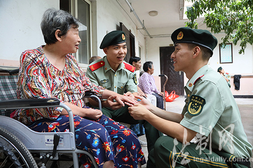 ????8月29日下午,江蘇邊防總隊連云港邊檢站面臨復退的戰(zhàn)士最后一次穿著軍裝走進駐地敬老院,看望他們“認親”的老人,送上他們退伍前的一聲祝福,并將“認親”的老人交到留隊的戰(zhàn)友手中,將這份愛心傳遞下去。據(jù)悉,這個站“認親”的傳統(tǒng)已經(jīng)延續(xù)了27年,每名官兵都有“認親”的孤寡老人,他們和老人之間建立了深厚的感情。(錢逸帆 王鈺)