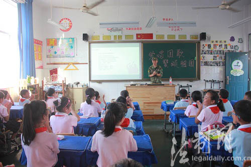 ????“起來,不愿做奴隸的人們,把我們的血肉鑄成我們新的長城……”一進門就聽到爵溪小學四年級三班響起了嘹亮的國歌聲,小朋友們正在爵溪邊防官兵的帶領下學唱國歌。