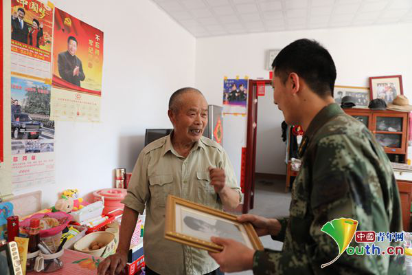 ????孟曉暉的爺爺孟慶欣也曾經(jīng)是一名解放軍戰(zhàn)士,并榮獲過獨立獎?wù)隆C慨斦f起自己的從軍經(jīng)歷時,這位年過八旬的老人都十分振奮,談到繼承了“紅色基因”的兒孫時,孟慶欣老人的驕傲與自豪更是溢于言表。他說,自己經(jīng)常把當年參軍的故事講給子孫聽,曉暉就是聽著爺爺?shù)墓适麻L大的,從小就說自己長大后也要當兵。在唱起這首凝聚了他熱血青春與報國壯志的軍歌之前,老人嚴肅地說道:“我要換上一身整潔的軍裝!”