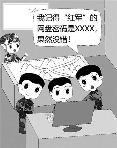 ????演練結(jié)束,這名文書坦言,他早就知道對方的網(wǎng)盤密碼。原來,此前,各營文書為了便于工作交流,有時會使用網(wǎng)盤傳輸或分享文件,一些網(wǎng)盤用戶名和密碼不少人都知道。這次演練前,“藍軍”營文書在用網(wǎng)盤調(diào)取查閱資料時,無意中在對方網(wǎng)盤中發(fā)現(xiàn)了秘密。