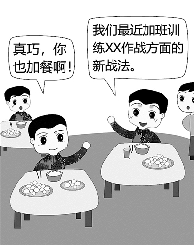 ????“真巧,你也來加餐啊?!薄笆前。覀儬I最近在研訓(xùn)新戰(zhàn)法,有時會加班訓(xùn)練……我跟你說,我們研究的新戰(zhàn)法主要是××作戰(zhàn)方面,據(jù)說要在全旅推廣呢!”