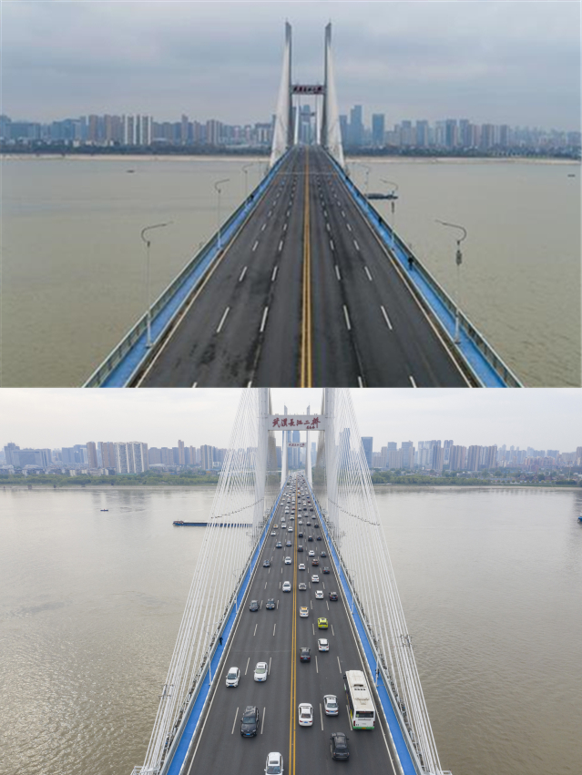 ▲上圖為2020年1月27日的武漢長江二橋。來源:中國日報;下圖為2020年4月14日的武漢長江二橋。新華社記者 才揚(yáng) 攝