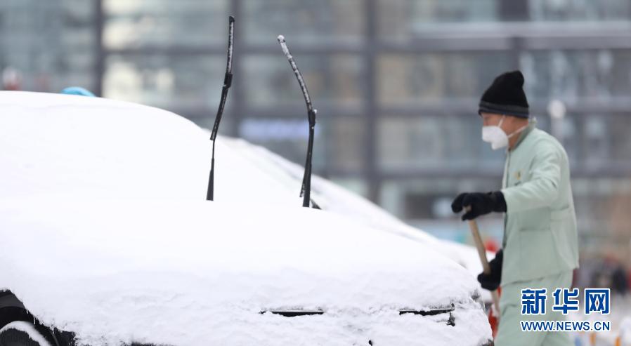 1月28日,在沈陽(yáng)市渾南區(qū),一名工作人員清掃停車(chē)場(chǎng)積雪。