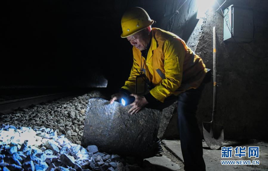 在廣西河池境內(nèi)黔桂鐵路線上的鄧山隧道,中國鐵路南寧局集團有限公司柳州工務(wù)段的4名看守工輪換值班,依靠手電筒在黑暗中穿行,及時巡查隧道中可能出現(xiàn)的各種隱患,確保每天經(jīng)隧道運行的59趟客貨列車春運安全。鄧山隧道全長773米,是一個需要人員全天候看守的鐵路隧道。