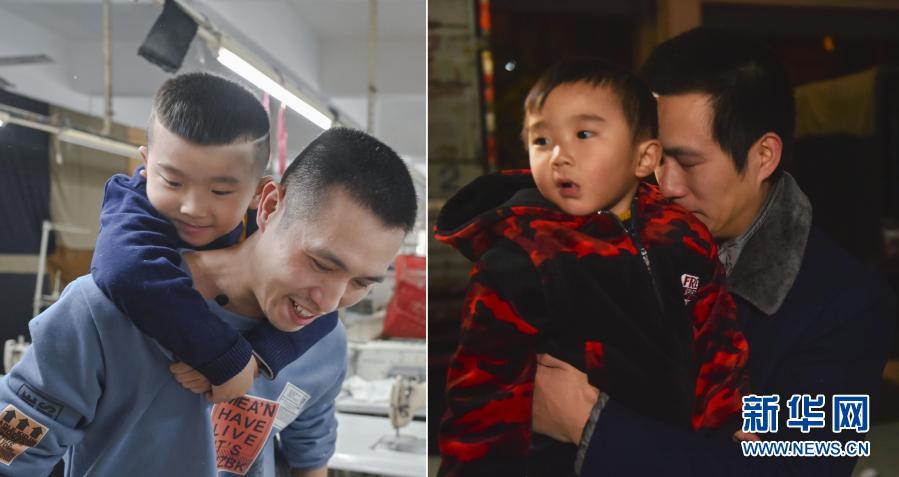 拼版照片:左圖為2021年1月26日,在福建省石獅市的金利萊斯服裝廠,聰聰和黃海龍?jiān)谝黄?;右圖為2018年2月2日凌晨,黃海龍即將登上返回四川的長途車,在上車前抱著不滿3歲的聰聰難舍難分。