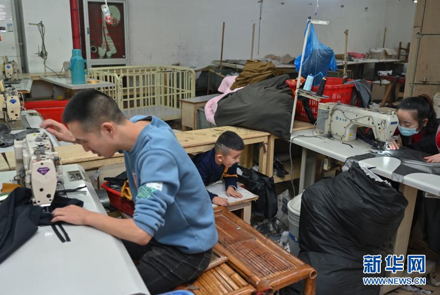 1月26日,在福建省石獅市的金利萊斯服裝廠,黃海龍和妻子在為老家的親人縫制枕頭和袖套,聰聰在一旁玩耍。