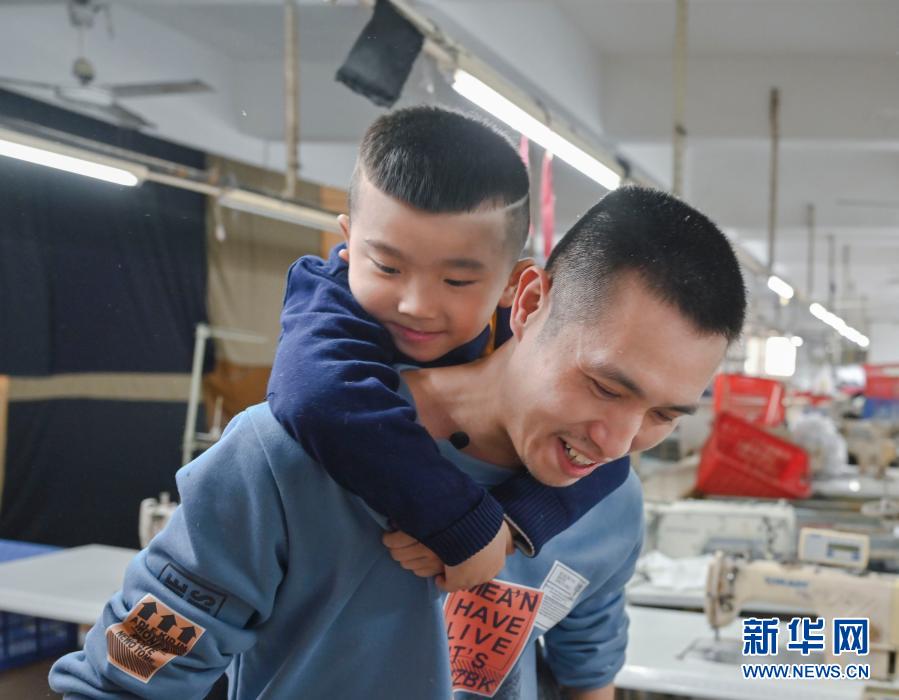 1月26日,在福建省石獅市的金利萊斯服裝廠,聰聰和黃海龍在一起。