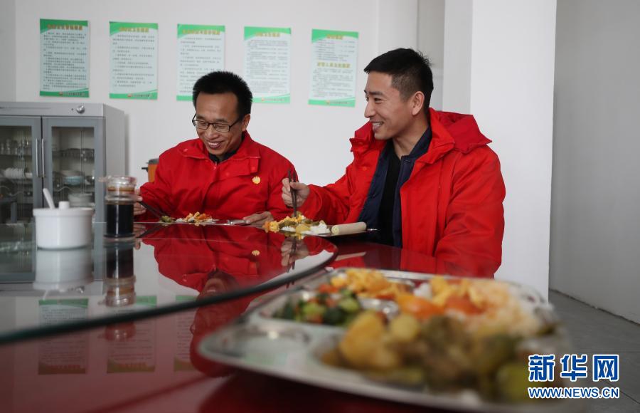 2月3日,在遼河油田建設(shè)有限公司管道第三項目部,來自河北衡水的概預(yù)算管理人員王殿凱(左)和來自河北邢臺的工程技術(shù)人員張浩在食堂吃飯。今年他們都留在當?shù)剡^年。