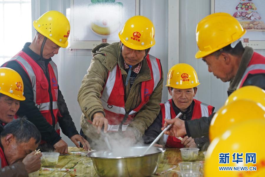 中鐵四局建筑工人們在工地食堂聚餐吃餃子(2月4日攝)。