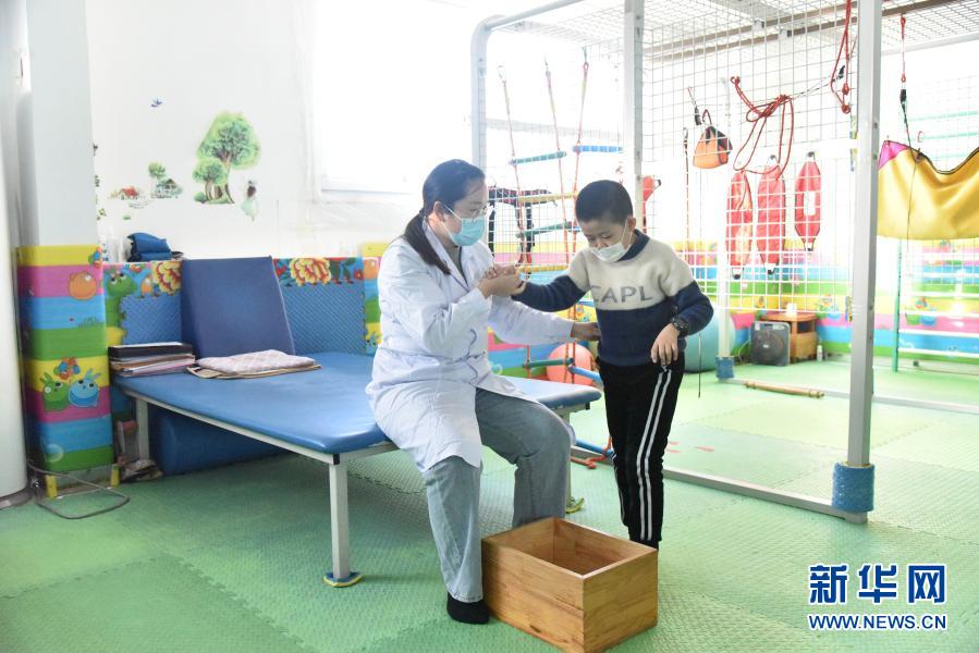 在哈爾濱博能中醫(yī)門診部,劉雨晴為腦癱兒童進行康復訓練(2月2日攝)。
