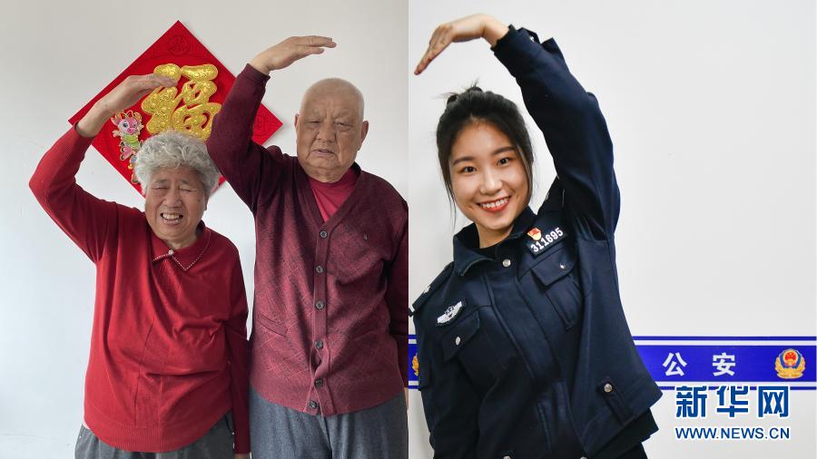 拼版照片:左圖為2月11日,在河北邯鄲居住的楊曉惠的爺爺與奶奶在家中比心(王洪超 攝);右圖為2月11日,楊曉惠在天津市紅橋區(qū)芥園派出所比心(孫凡越 攝)。