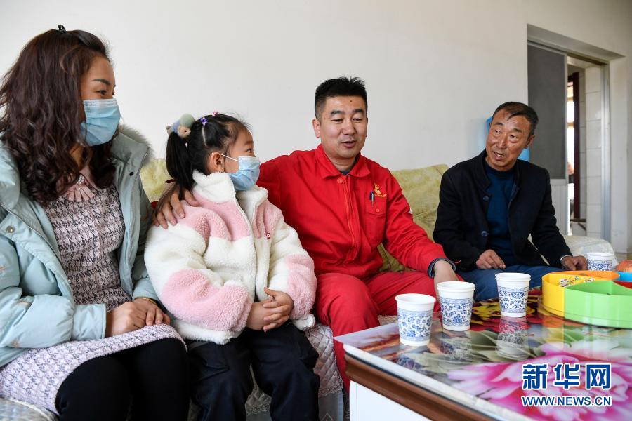 2月11日除夕當(dāng)天,王濤(右二)和妻子女兒走訪看望脫貧戶劉玉強(qiáng)(右一)。劉玉強(qiáng)家過去住的是土房,2017年脫貧并蓋了新房,2019年還開起了農(nóng)家樂。