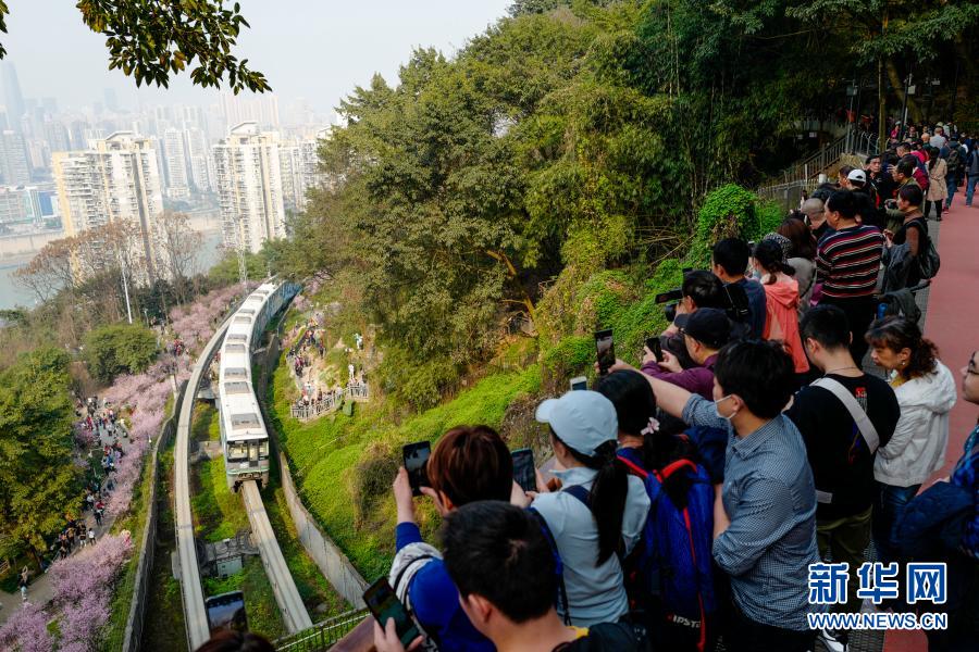 2月23日,在重慶軌道交通2號線佛圖關段,游客在山城步道上拍攝穿越花海的單軌列車。