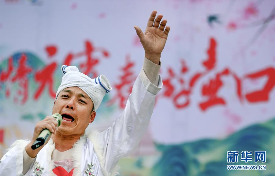 2月24日,歌手楊平安在陜西壺口瀑布景區(qū)為游客演唱陜西民歌。