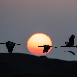 日出時(shí)分,黑頸鶴在大山包黑頸鶴國(guó)家級(jí)自然保護(hù)區(qū)飛翔(2月27日攝)。